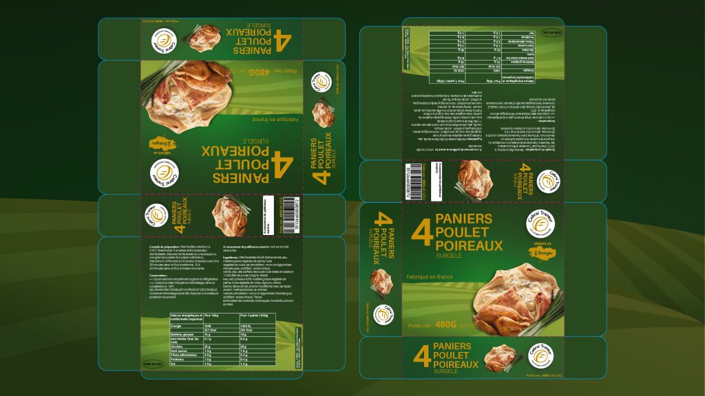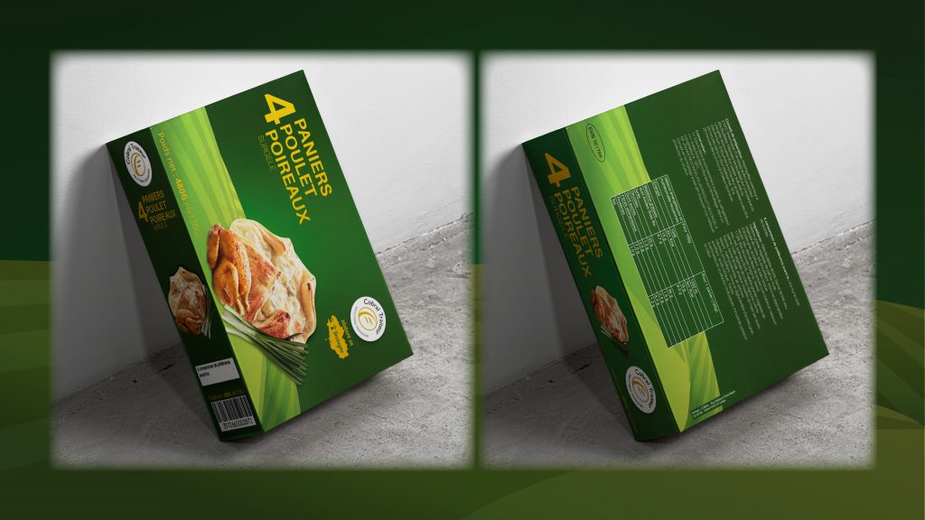 Voici mon premier packaging ! Nous devions concevoir un emballage sur mesure pour Cobral, une marque de traiteurs surgelés. L’objectif était de créer un packaging adapté aux paniers de poulet poireaux premium. J’ai donc entièrement recréé le tracé de découpe et mis en place tous les aspects techniques avant de passer à la conception graphique.